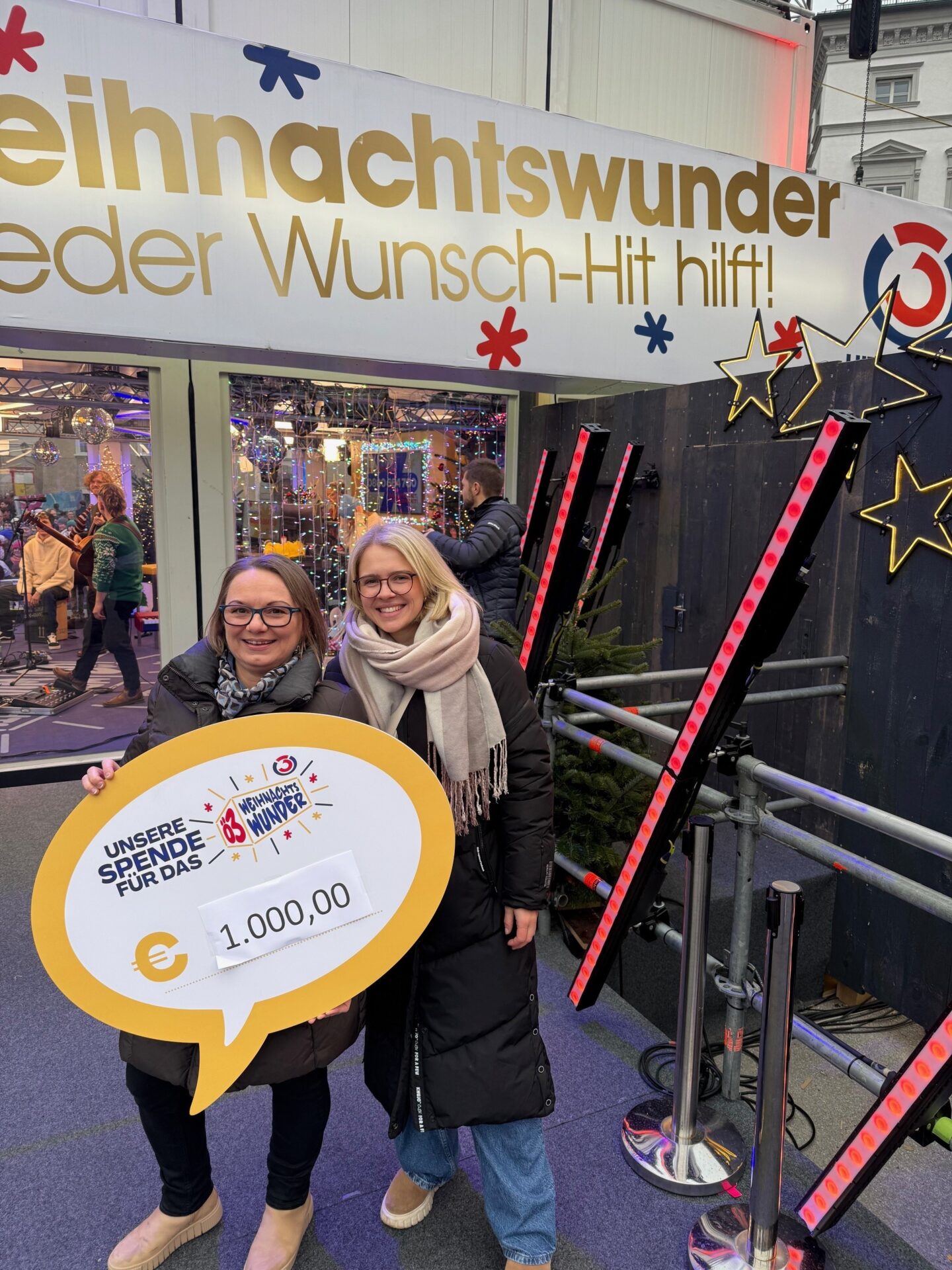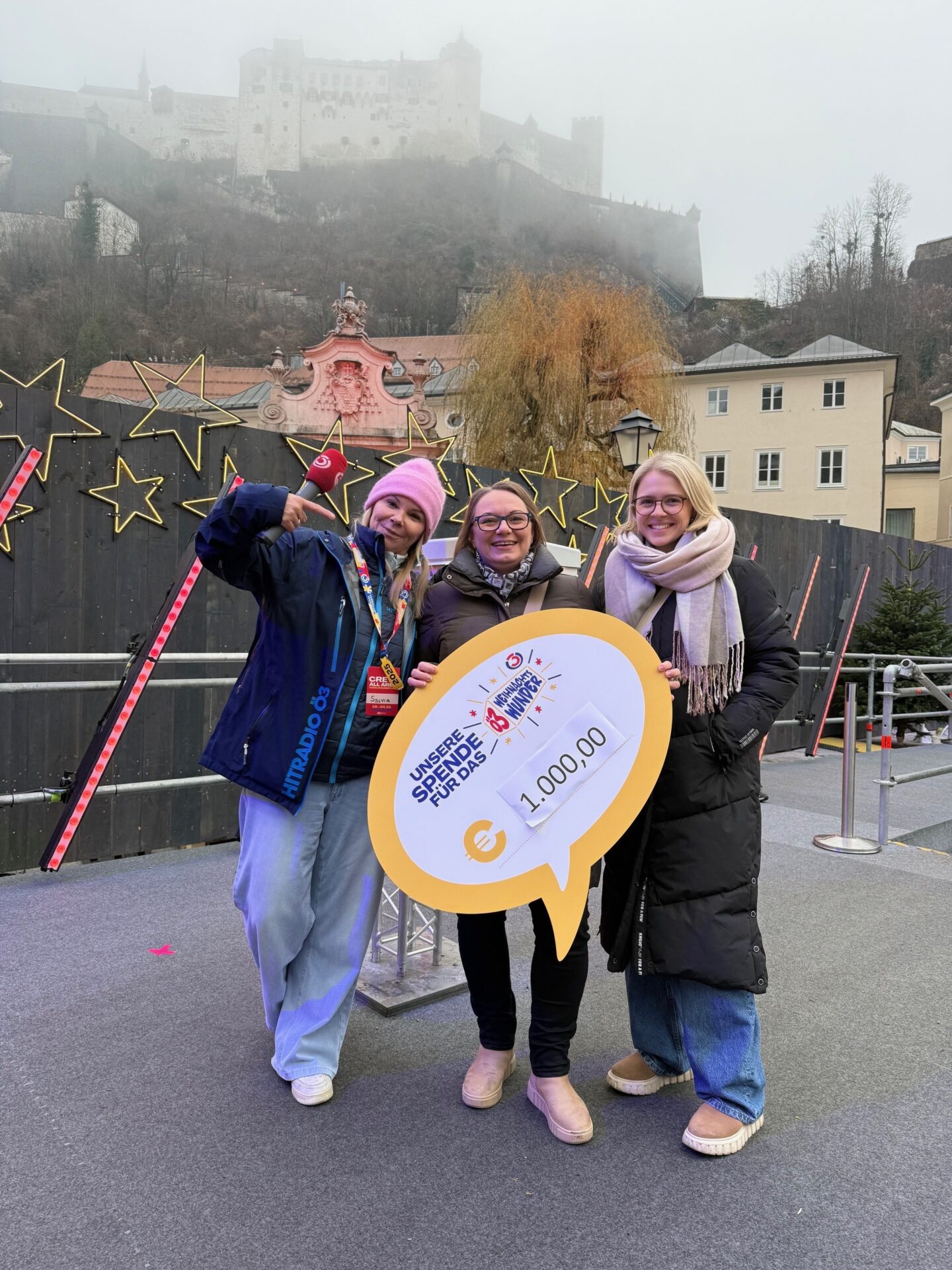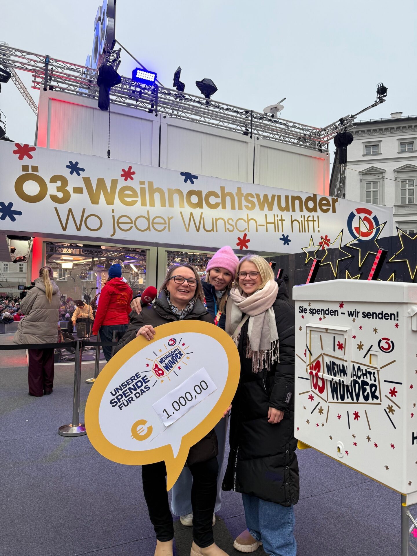 Mit großer Freude dürfen wir verkünden, dass durch den Punschstand im OptimaMed Rehabilitationszentrum Aspach insgesamt 1.000 Euro an Spenden gesammelt wurden. Initiiert wurde die Aktion von unserer engagierten Diätologin Petra Huber, die gemeinsam mit ihrer Kollegin Vanessa Fröhlich die Spendenübergabe an das Ö3 Weihnachtswunder in Salzburg übernommen hat.